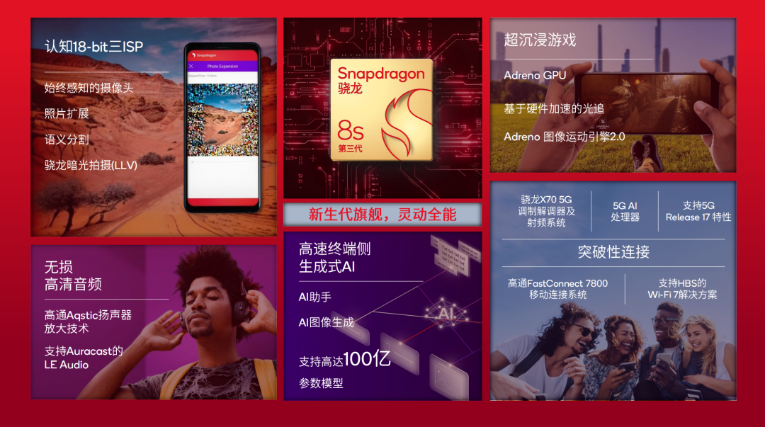 层级扩展后,定位顶级旗舰与创新标杆的骁龙 8 系,就像一颗颗强劲的引擎,每年都在引领手机迈向更高更强;而定位灵动全能,具备一系列实用特性的 “ 新生代旗舰 ” 骁龙8s Gen3,则是进一步细化了旗舰性能与体验。