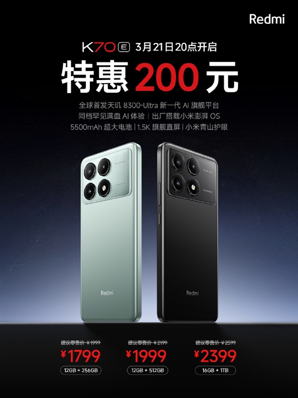 快科技3月21日消息,Redmi官方宣布,今晚20:00,Redmi K70E将开启200元特惠活动,到手价1799元起。