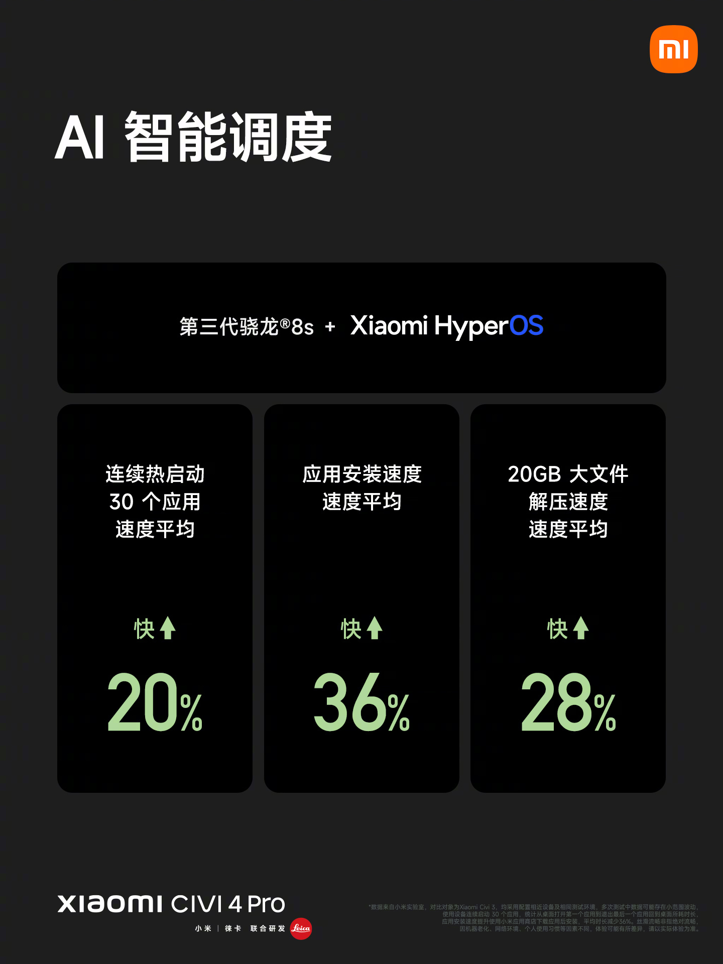 值得一提的是,小米联合高通将第三代骁龙 8s 定义为“新生代 AI 旗舰平台”,新机连续热启动 30 个应用速度平均快 20%,应用安装速度平均快 36%,20GB 大文件解压速度平均快 28%。
