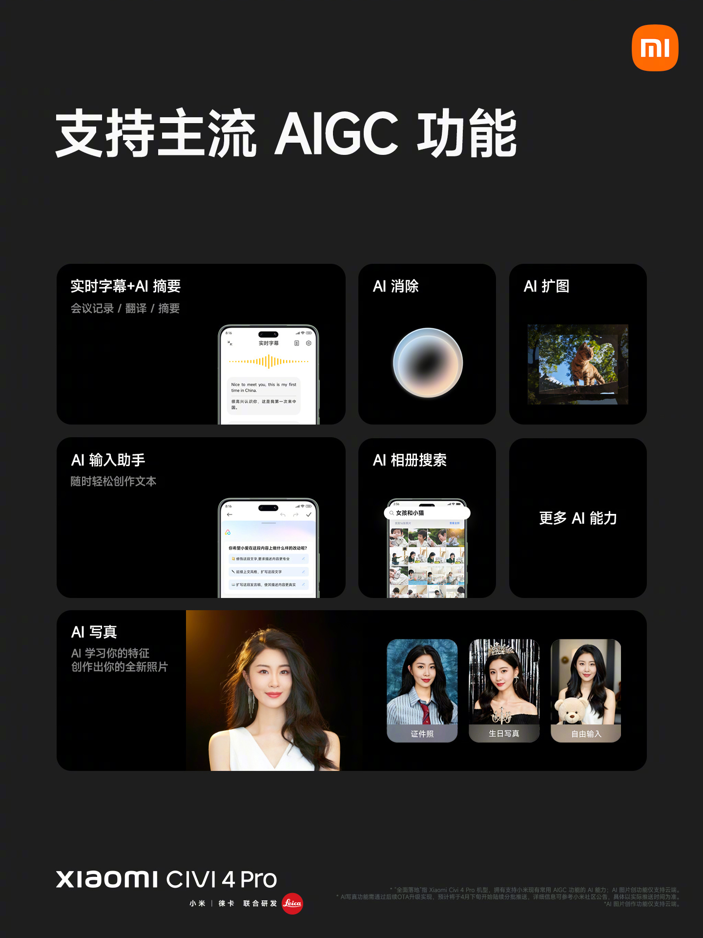 AIGC 方面,新机支持实时字幕 + AI 摘要、AI 输入助手、AI 写真、AI 扩图、AI 消除、AI 相册搜索等。