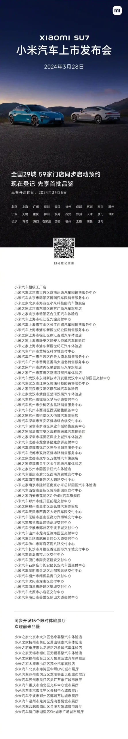 据悉,小米汽车SU7将于3月28日正式上市交付。在此之前,全国已有29个城市的59家门店同步开启预约服务,并计划于3月25日开启品鉴活动,让消费者能够近距离感受SU7的魅力。此次品鉴活动将覆盖北京、上海、广州、深圳等一线城市,以及杭州、成都、武汉等经济发达城市,充分展现了小米汽车在全国范围内的布局和影响力。