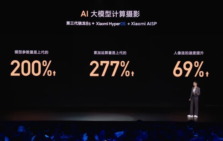 AI 大模型计算摄影方面,新机模型参数量是上代的 200%,累加运算量是上代的 277%,人像连拍速度提升 69%。