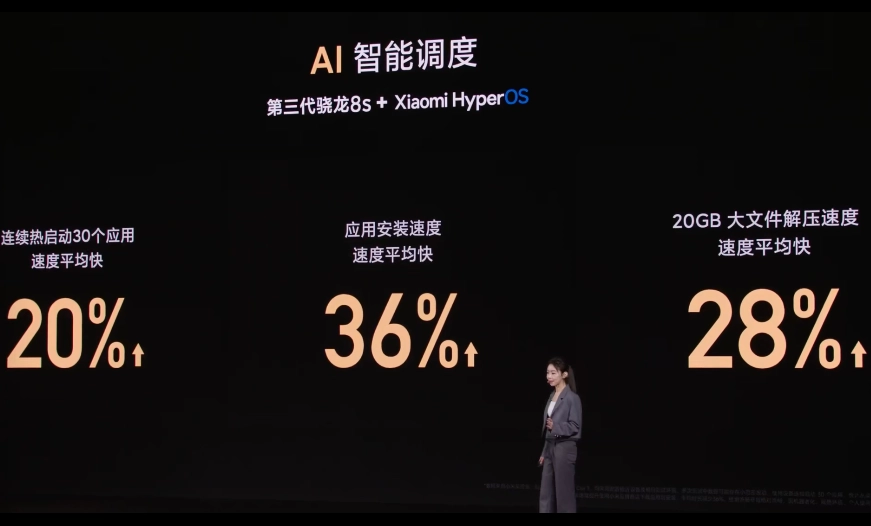 AI 智能调度方面,新机连续热启动 30 个应用速度平均快 20%,应用安装速度平均快 36%,20GB 大文件解压速度平均快 28%。