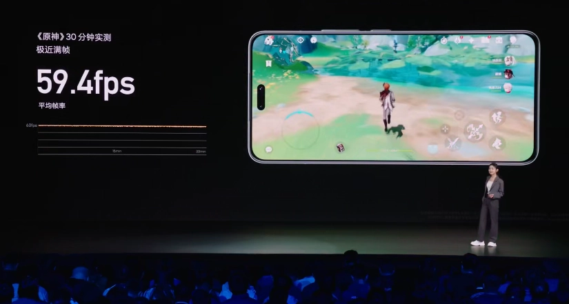 在骁龙 8s Gen 3 处理器以及 4184mm² 超大环形冷泵的加持下,新机《原神》30 分钟实测极近满帧,平均帧率达到 59.4 fps。