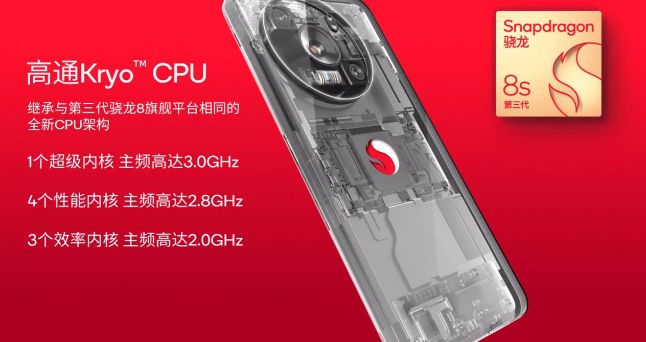 首先在基础的性能上,第三代骁龙 8s 移动平台搭载的仍然是高通 Kryo CPU,继承与第三代骁龙 8 顶级旗舰平台相同的全新 CPU 架构,包含一个主频为 3.0GHz 的超级内核、4 个主频高达 2.8GHz 的性能内核和 3 个主频为 2.0GHz 的效率内核,对比第三代骁龙 8 在核心频率上自然有一定下降,但整体仍然是非常高的水平。