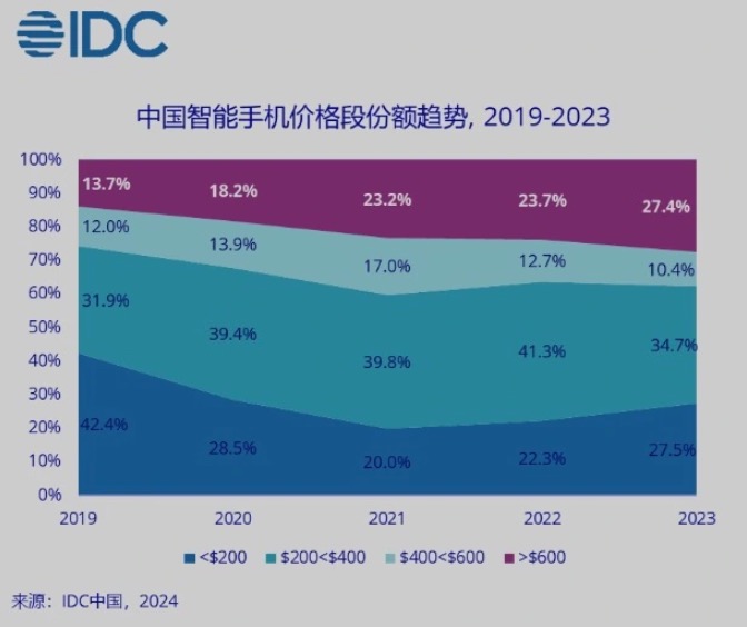 除了 AI,高端化将仍然是今年手机市场追逐的主要目标。根据调研机构 IDC 的报告,2023 年,中国智能手机市场 600 美元以上高端市场份额达 27.4%,同比增长了 3.7 个百分点,而代表中端的 200-600 美元产品的市场空间正在收窄。