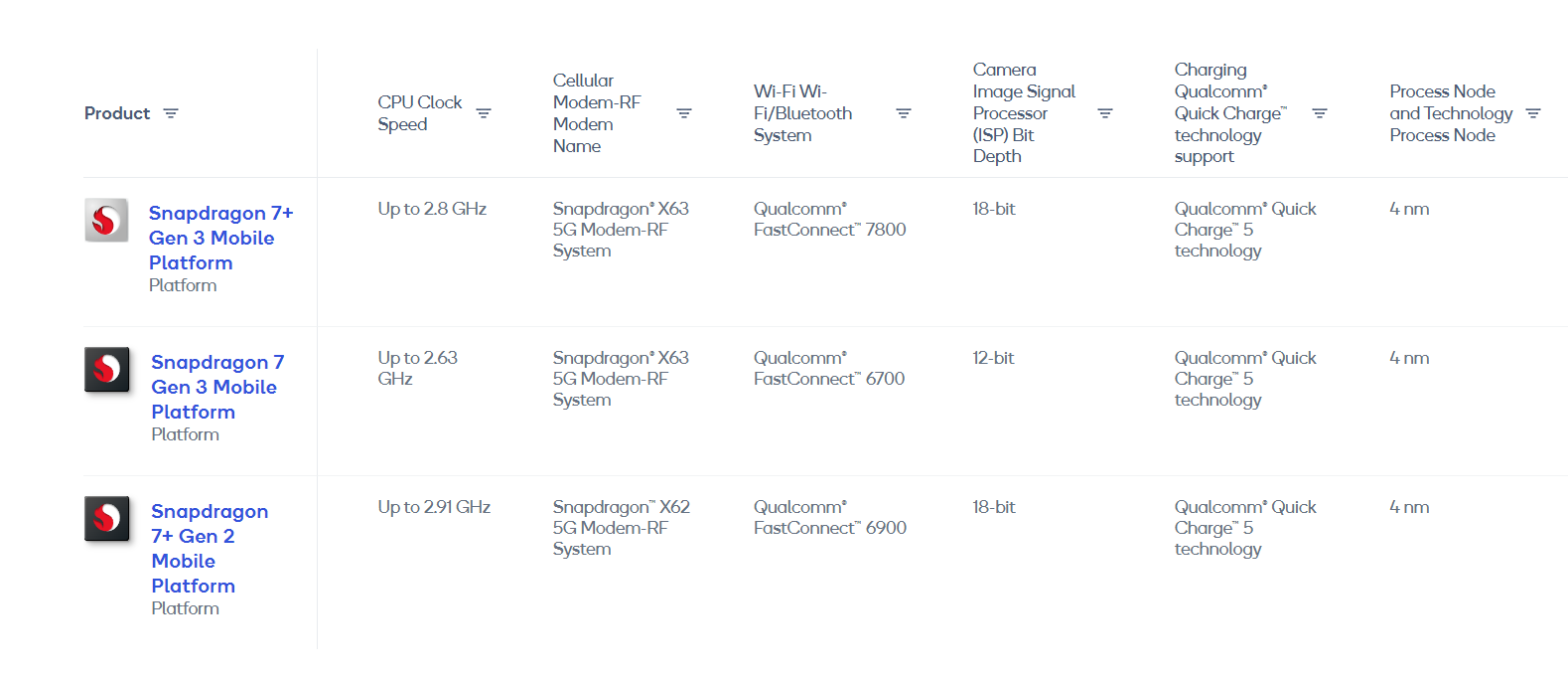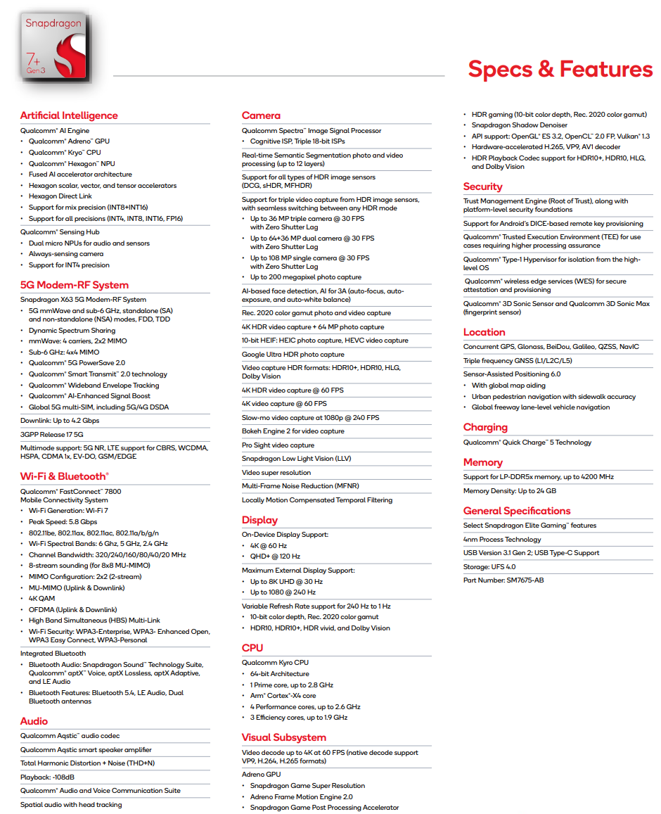 第三代骁龙 7 + 支持部分 Snapdragon Elite Gaming 的全新特性,包括游戏后处理加速器和 Adreno 图像运动引擎 2.0。此外,该平台支持 18-bit 认知 ISP。