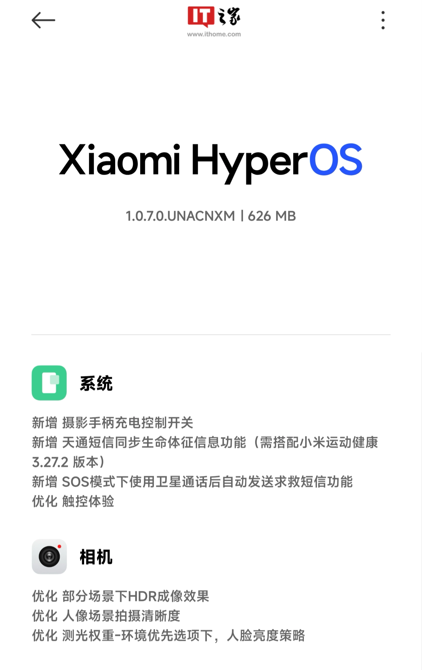 IT之家 3 月 21 日消息,据小伙伴投稿,小米 14 Ultra 手机今日获推 HyperOS 公测版更新,版本号为 1.0.7.0.UNACNXM,更新包体积为 626MB。