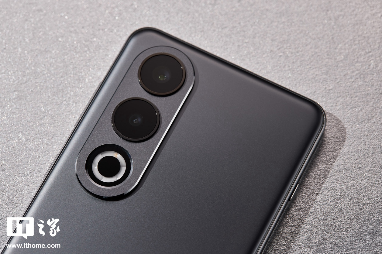 整机仍然延续了上代机型简洁硬朗的设计,不过在摄像头 Deco 部分,采用了全新的设计,双摄模组和环闪纵向排列在机身顶部的铝合金材质底座上,配合不锈钢镜头保护圈与高亮的 CNC 边缘,精致且坚固。
