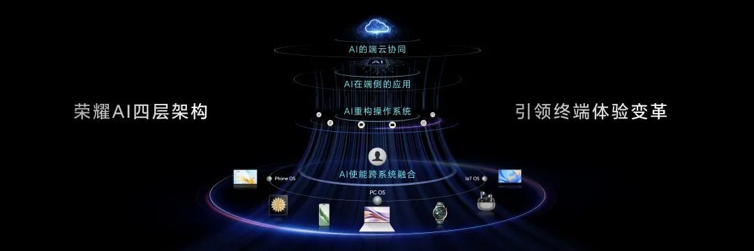 在荣耀的计划中,“要AI”的还不只有手机,其CEO赵明认为,在跨操作系统和跨设备的时代,你可以有一个 ” 胖终端 “,在那种情况下,同一账号下荣耀的手机、平板、笔记本电脑、穿戴和 IOT 的产品可以说融合成一个完整的设备。而这一“设想”,也正是荣耀如今所做的——将AI做到平台级赋能。