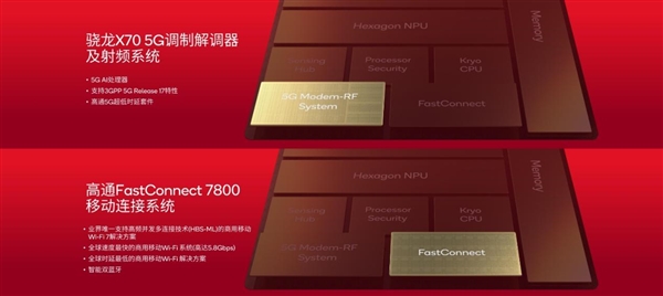 基带方面配备旗舰同款的骁龙X70,是全球首个集成了5G AI处理器的基带,可以利用AI优化Sub-6GHz、毫米波频段的5G链路,提升速度、网络覆盖、移动性、链路稳健性、能效,并降低时延。