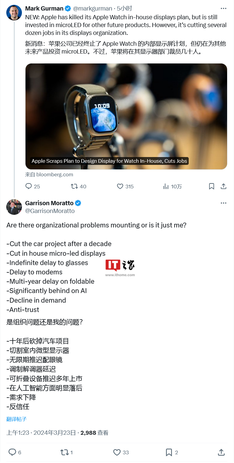 分析师郭明錤(Ming-Chi Kuo)和显示供应链咨询公司(Display Supply Chain Consultants)今年 2 月都认为,苹果已经取消了 microLED Apple Watch 的研发工作,不过古尔曼此前认为仍在研发这款设备,而现在古尔曼撤回此前观点,在推文中表示“我怀疑它 [指 MicroLED Apple Watch 项目] 已经被取消了”。