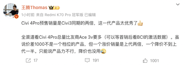 甚至搬出了贵一千块的小米Civi 4 Pro的销量,对一加持续输出。