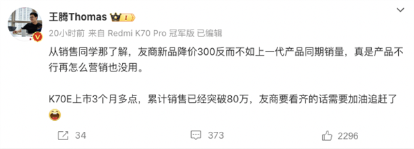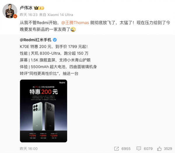 到了晚上直接官宣给红米K70E降价二百,卖到了1799起,还得到了卢伟冰的认可。