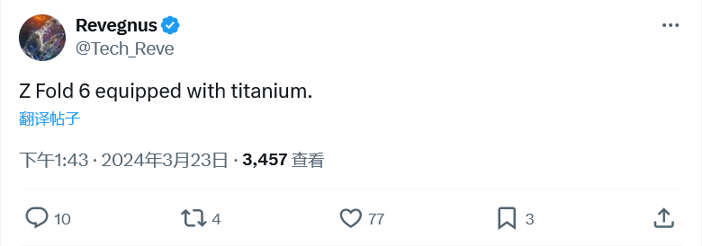 IT之家 3 月 23 日消息,消息源 @Tech_Reve 近日发布推文,表示三星 Galaxy Z Fold6 手机将会采用钛金属材质,可能是为了进一步拉大和 Galaxy Z Fold6 FE 手机之间的区分。