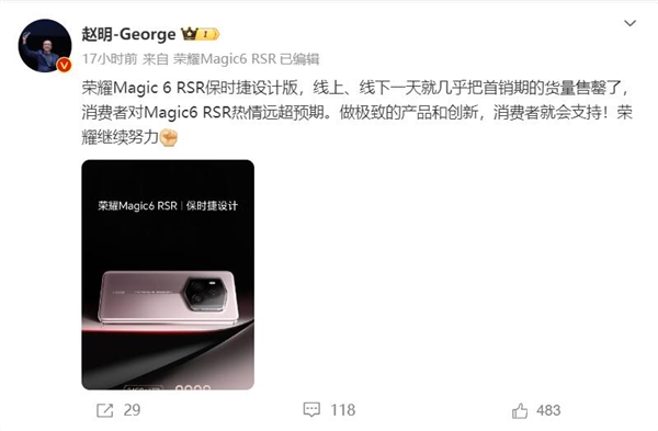 荣耀CEO赵明在微博上表示,荣耀Magic6 RSR 保时捷设计在线上和线下一天内几乎售罄了首销期的货量,消费者对该款产品的热情远超预期,这充分表明了消费者对极致产品和创新的支持,荣耀将继续努力。