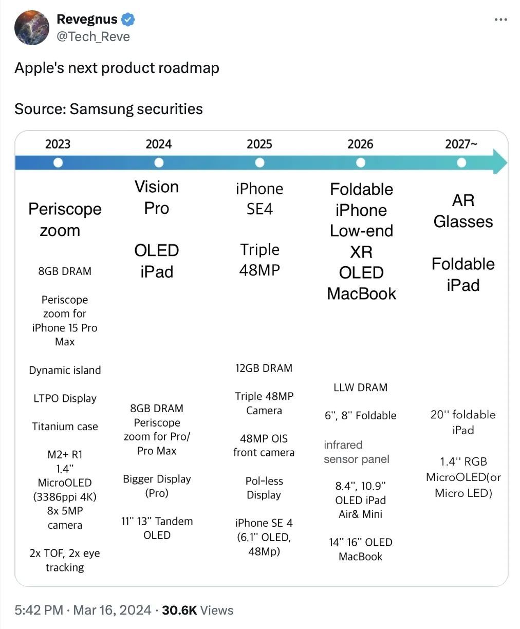 另外,根据 Revegnus( Tech_Reve)在 X 平台账号上的爆料,同样确认了苹果将于 2026 年推出折叠屏手机,并从爆料中了解到折叠版 iPhone 的尺寸为:折叠后 6 英寸,展开后 8 英寸,看来,需要折叠屏 iPhone 的小伙伴,真的要等到 2026 年了。