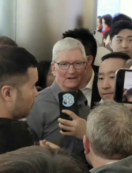 这一场景引发了不少网友的调侃:苹果大BOSS来到中国,却让华为手机抢了风头!