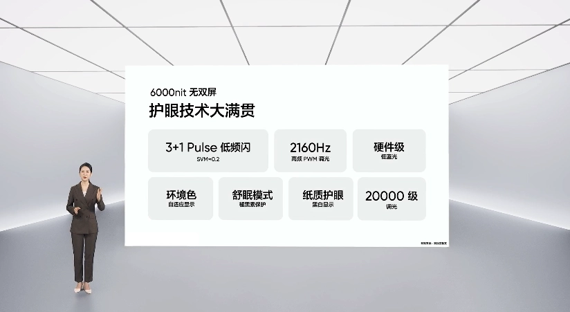 此外,该屏幕还带来全新护眼技术,支持 3+1 Pulse 低频闪、2160HzPWM 调光、硬件级低蓝光、环境色自适应显示。