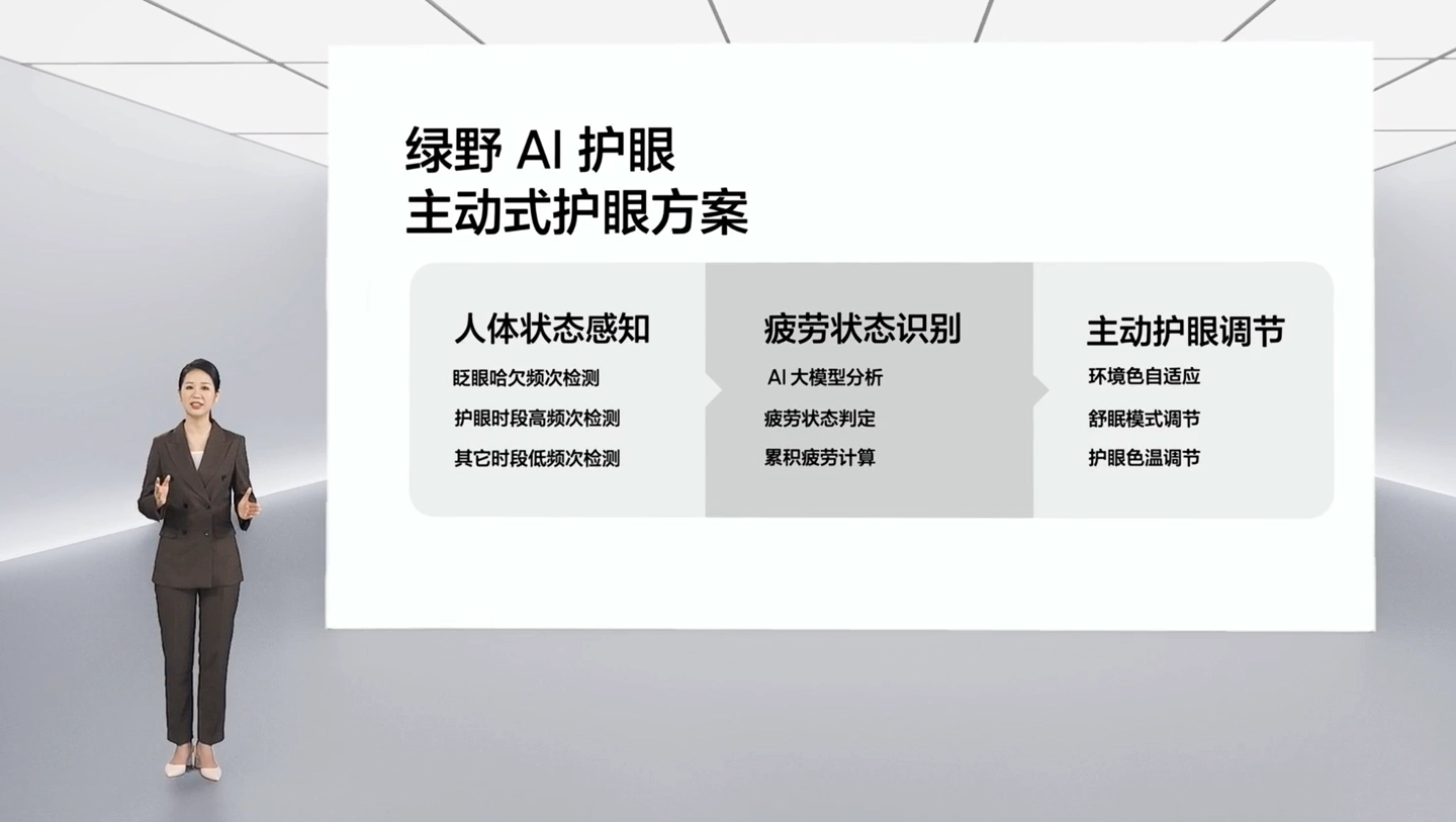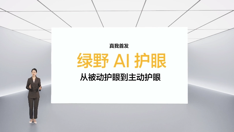 不仅如此,realme 还宣称“告别参数护眼,进入主动护眼时代”,首发“绿野 Al 护眼”。据介绍,该功能在行业首次引入主动疲劳检测技术,智能检测疲劳状态,调节护眼方案,实现刷视频、电子书等全场景适配。
