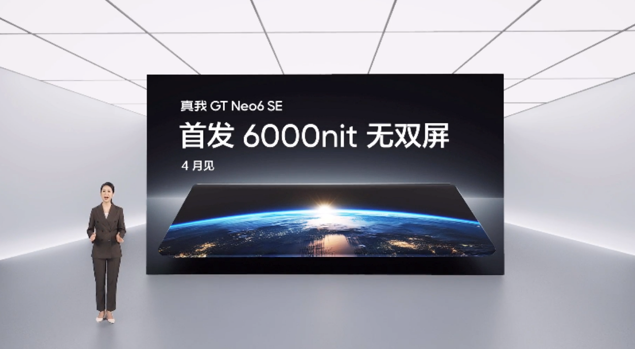 在活动的最后,realme 宣布真我 GT 系列将全系搭载无双屏,其中真我 GT Neo6 SE 手机将在 4 月首发 6000 尼特无双屏。
