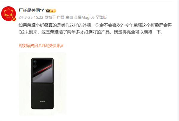 今天,数码博主“厂长是关同学”曝光了荣耀小折叠手机产品的大致外观,并称这是荣耀憋了两年多才打磨好的产品,会在今年二季度末期正式发布。