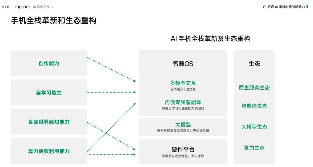 直到2022年年底ChatGPT一炮而红,2023年百模大战如火如荼,到了2024年2月,IDC联合OPPO发布了一份《AI手机白皮书》,提出了定义AI手机的四项全新标准——
