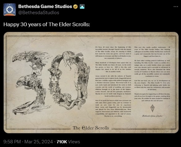 三十年的今天(1994年3月25日),首部上古卷轴游戏《The Elder Scrolls:Arena》问世,Xbox团队为旗下TES品牌庆生: