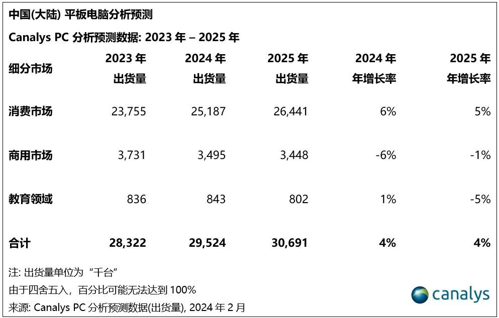 由于数字化进程的深入和渗透率的提高,平板电脑市场预计在 2024 年和 2025 年都将增长 4%。