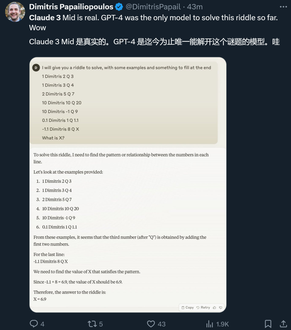 在 Anthropic 官宣之后,不少得到试用机会的研究者也晒出了自己的体验。有人说,Claude 3 Sonnet 解出了一道此前只有 GPT-4 才能解开的谜题。