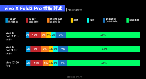 从 3 小时续航测试结果来看,即便是纯用内屏,vivo X Fold3 Pro 的续航表现也跟直板旗舰差不多,妥妥用一天没啥问题。