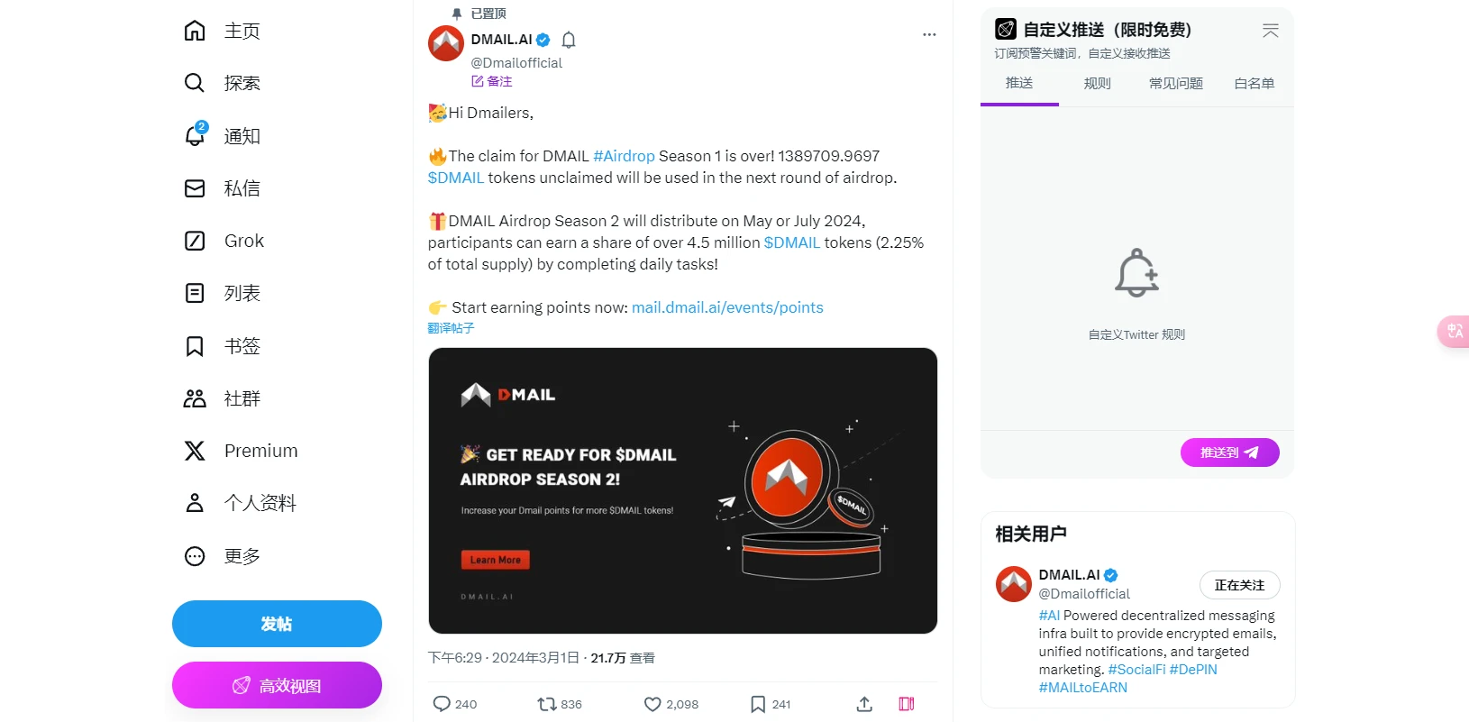 3 月 1 日,DMAIL 在 X 平台发文宣布,第二期代币空投将于 2024 年 5 月或 7 月进行分发,本次主要奖励平台中的积分用户。目前在 DMAIL 平台可以在多条链进行邮件往来。因此,通过 DMAIL “发邮件”交互最大的优势是可以以极低的成本保持参与其他生态项目的钱包活跃度。
