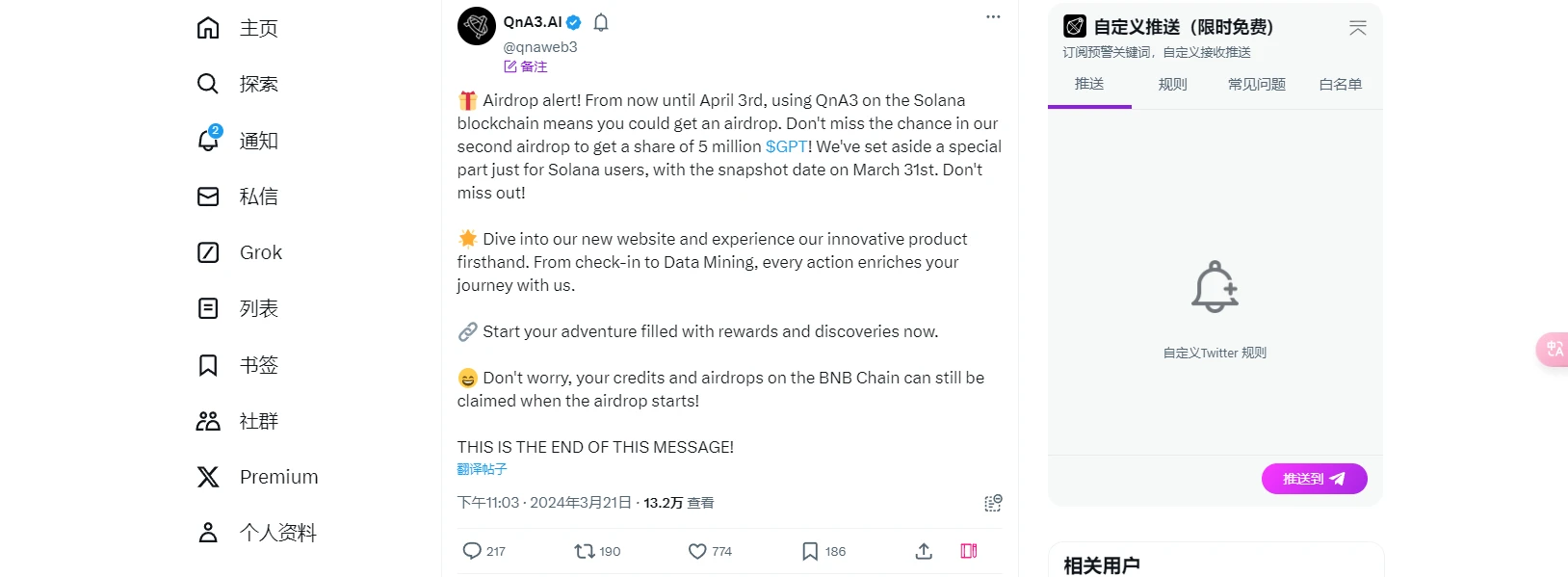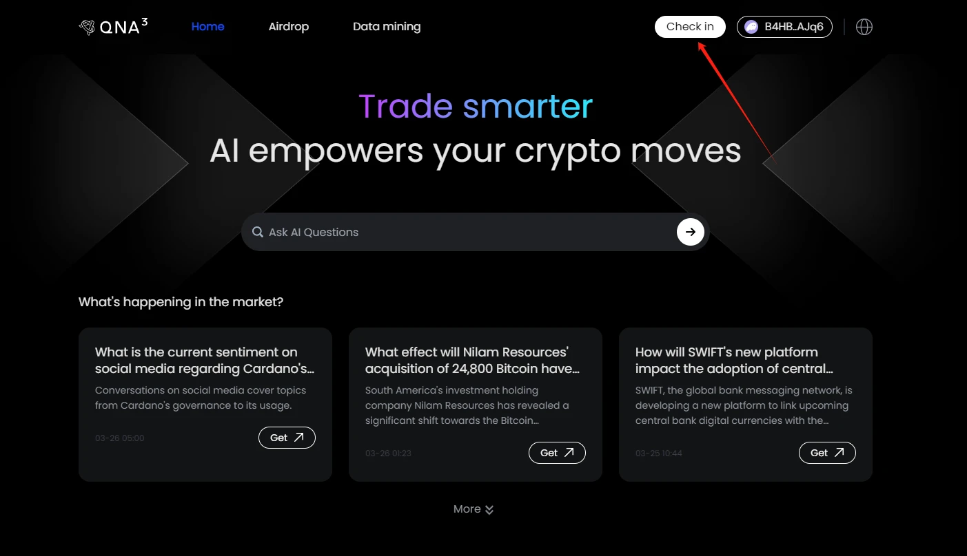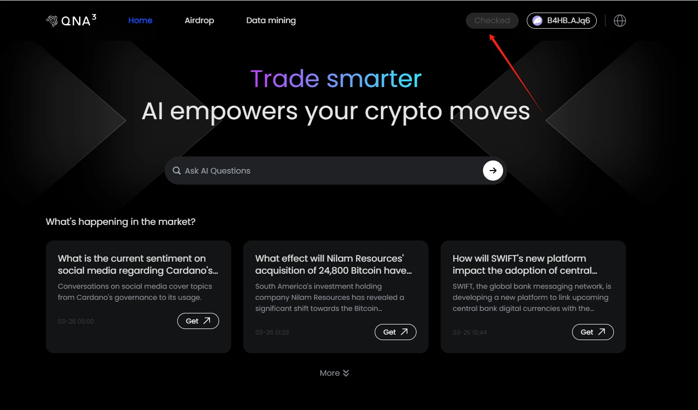 3 月 21 日,QnA3.AI 在 X 平台发文宣布,通过在 Solana 链上使用该平台将有机会获得第二期代币空投。虽然 QnA3.AI 第一期代币 GPT 空投受到一些争议,但本次 Solana 链交互的时间短、成本低,并且 GPT 作为 AI 板块中热度较高的项目,值得参与。