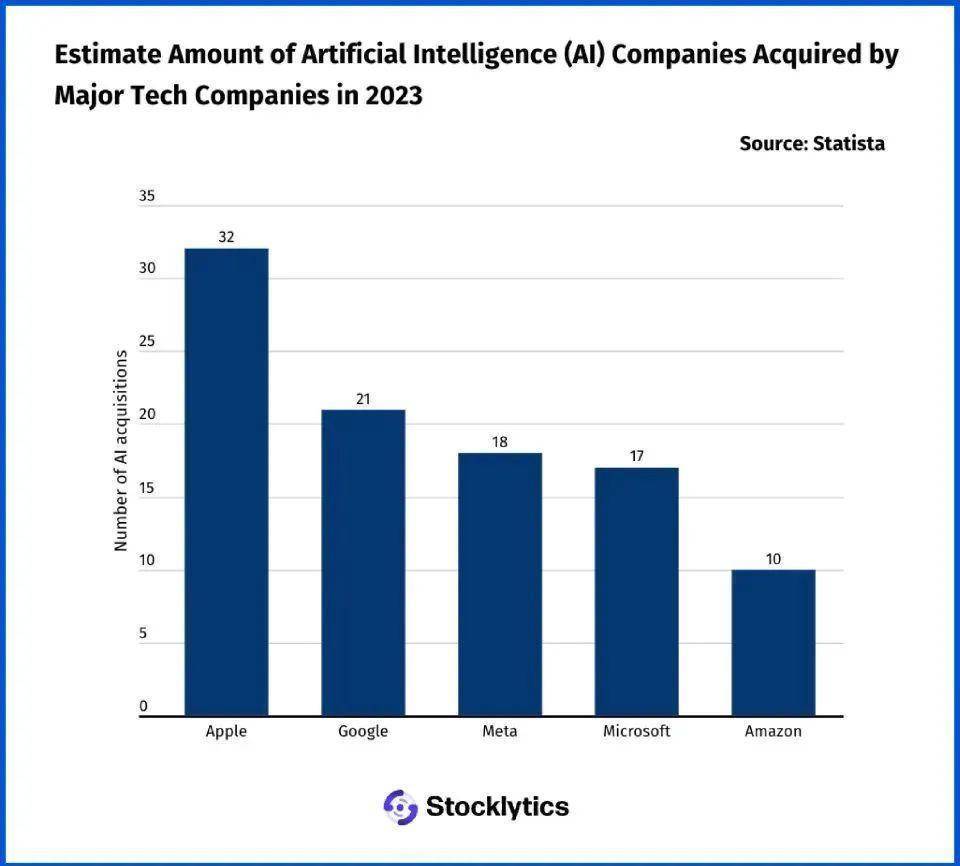 截止到 2023 年,苹果总共收购了 32 家 AI 公司,位列科技巨头中收购榜第一。而收购 Siri,应该可以算作苹果入局 AI 的开端。