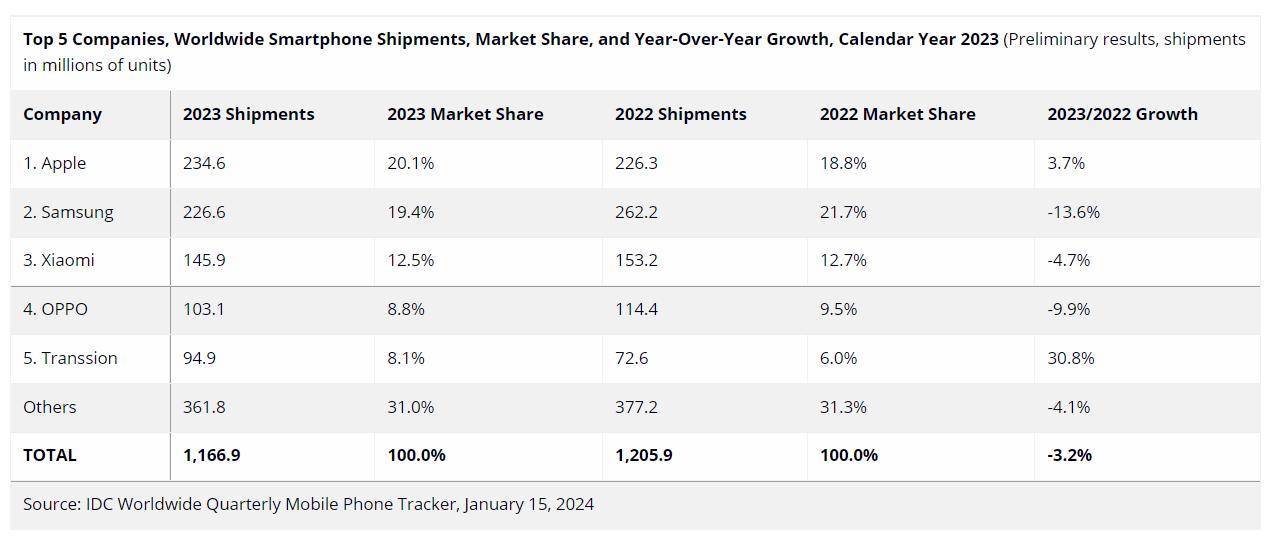 根据国际数据公司 IDC 的统计,三星在 2023 年全球智能手机市场占有率达到了 19.4%,苹果则成功登顶达到了 20.1%。