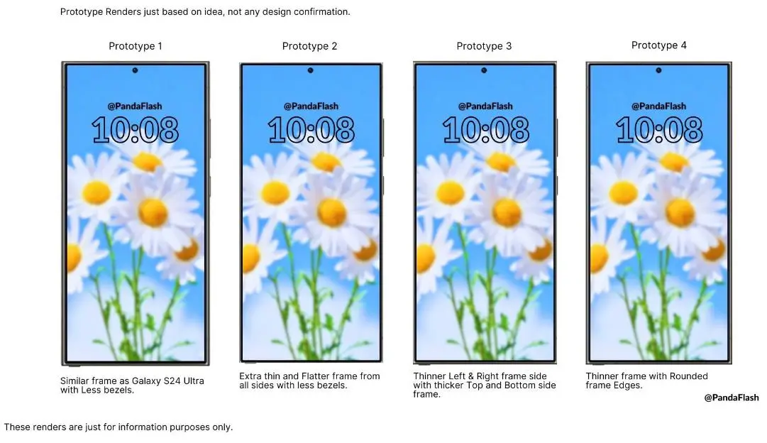 三星已经提前开始了其 Galaxy S25系列的研发工作,最新消息围绕着明年的高端机型 Galaxy S25 Ultra 展开。从最新的渲染图来看,似乎有四款原型机正在进行测试,每个版本都有不同的尺寸,边框尺寸也各不相同,显然产品正在测试中,三星很可能还未决定选择哪款机型。