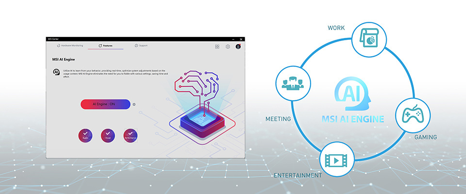 该系列电脑配备微星 AI 引擎,能自动根据用户场景切换性能模式、音效与显示模式。