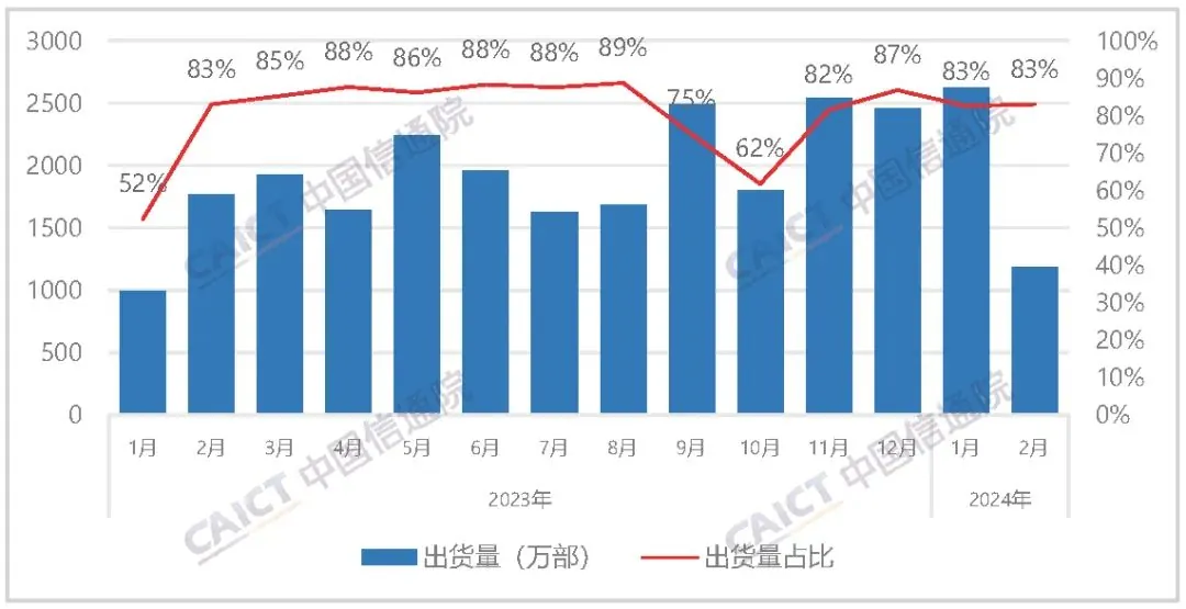 中国信通院发布 2024 年 2 月国内手机市场运行分析报告:出货量 1425.7 万部,其中 5G 手机占比 87.9%
