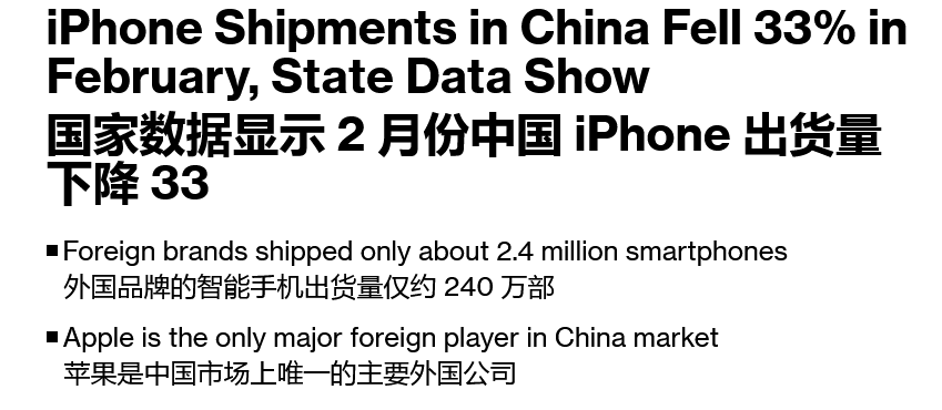 文章来源于互联网:IT之家-报告称 2 月苹果 iPhone 在华出货量减少 33%
