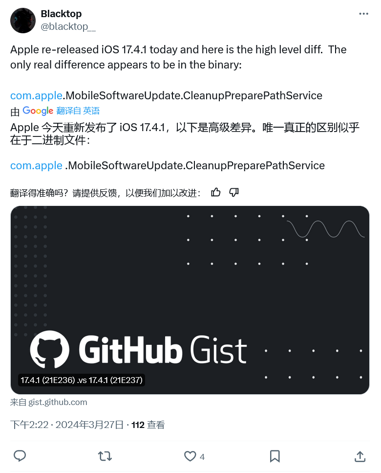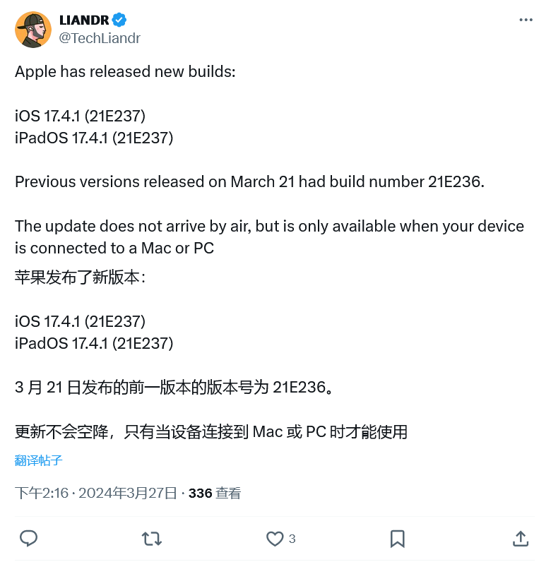 IT之家 3 月 27 日消息,苹果公司悄然再次发布 iOS / iPadOS 17.4.1 更新,3 月 22 日发布的内部版本号为 21E236,而最新版本号为 21E237,目前尚不清楚修复了哪些内容。