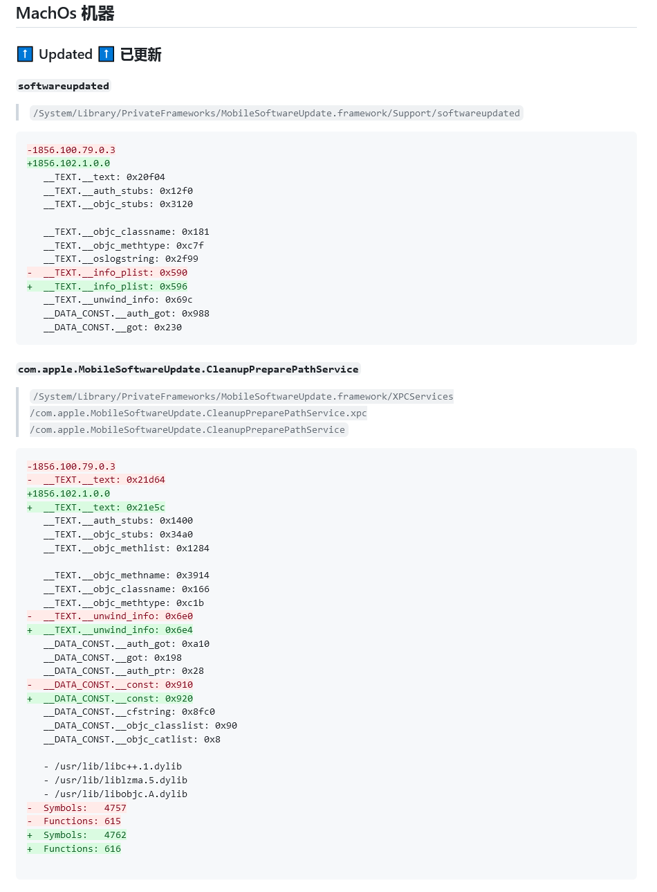 根据网友对比,主要是安装文件中新增了 com.apple.MobileSoftwareUpdate.CleanupPreparePathService。