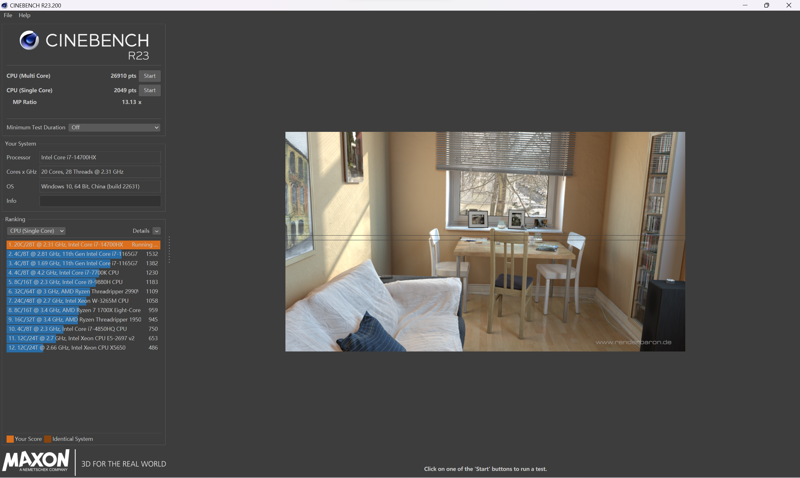 在 R23 中,微星神影 16 2024 拿下了单核 2049,多核 26910 的成绩,表现非常出色。