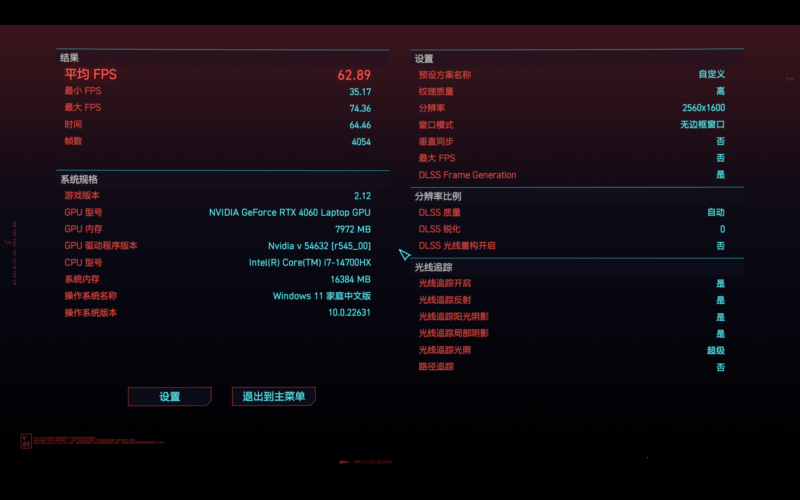 首先,是未开启 DLSS 和光追下,2560×1660 分辨率,最高画质下的表现,实测为平均 42fps。不过笔者相信,没有玩家会拒绝“DLSS”,要知道 DLSS 是一项由 AI 驱动的性能倍增技术,拥有开创性的光学多帧生成功能,开启之后画质不变帧率剧增。所以该画质实测仅为简单验证 RTX4060 的性能表现,并不具备代表性。