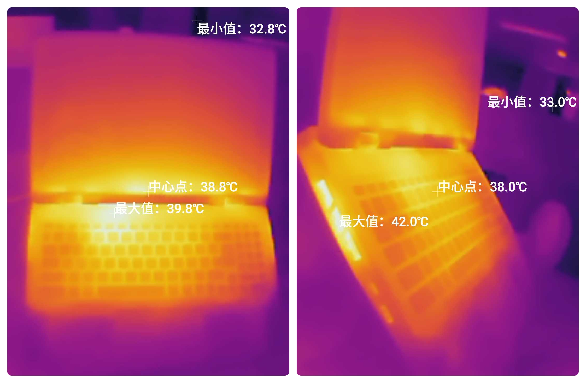 烤机时,通过热传感测温枪监测,最高温度为左右两侧的出风口区域,达到了 42°C,机身键盘区域的温度则维持在 40°C 上下。