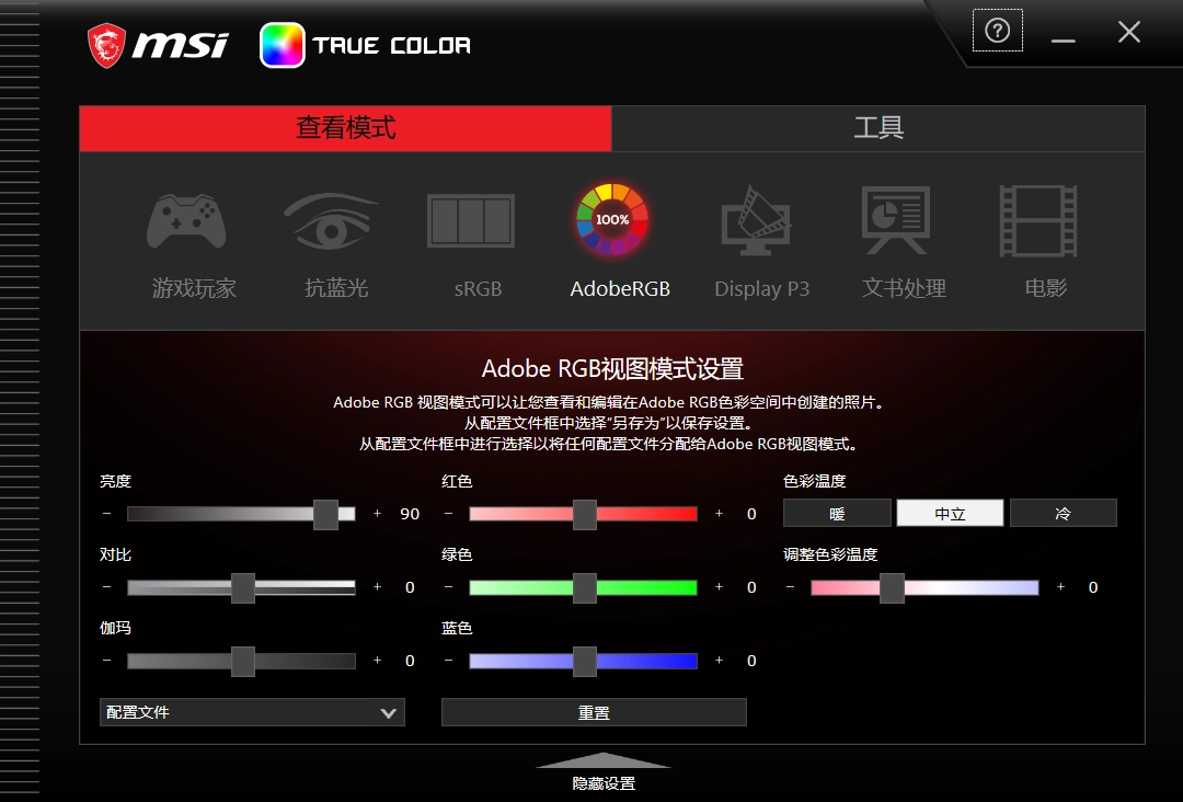 此外,微星还提供“MSI True Color”应用,这是一款专业屏幕色彩管理软件,用户可通过软件主页面一键切换 sRGB、Adobe RGB 以及 Display P3 色域,每个色域还支持选项丰富的自定义调节。