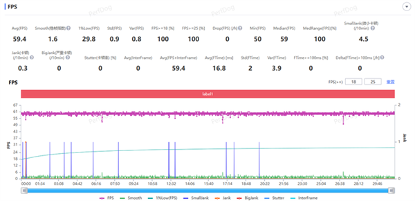 经过Perfdog的测试,vivo X Fold3 Pro在《原神》游戏中可以达到59.4FPS的平均帧率,游戏过程中帧率曲线也趋于直线,游戏画面十分的稳定流畅,具备了优秀的游戏体验。作为一款高性能的平板电脑,vivo X Fold3 Pro游戏性能非常出色。