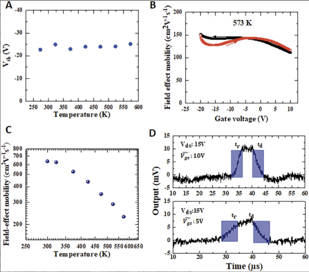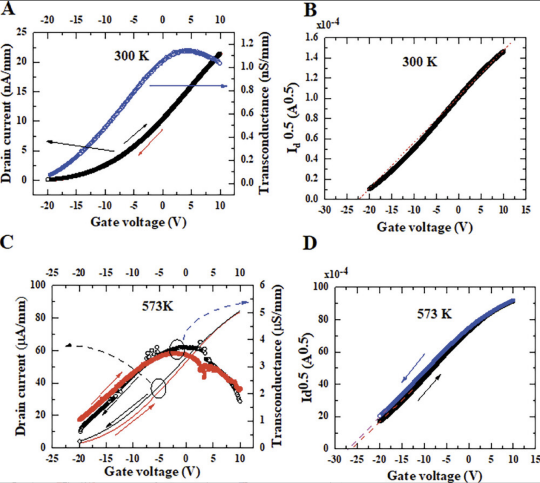 图2C显示了矩形 MOSFET 的 漏极电流 ( Id )(通过栅极宽度归一化)与漏极电压 ( V ds )的关系。在这里,我们展示了在三个温度下测量的Id – Vds特性:300 K (RT)、423 K (150 °C) 和 573 K (300 °C)。MOSFET 的栅极电压 ( Vgs ) 在 -20 至 10 V 之间变化,步长(steps)为 5 V。漏极电流由栅极电压很好地调制,显示出典型的 n 型沟道晶体管行为。Vds = 20 和Vgs = 5 V 时的最大漏极电流 ( I d,sat )在 300 K 时约为 0.027 µA mm-1。然而,进一步增加V gs > 5 V 导致漏极电流几乎没有改善,因为到高串联电阻。直到 MOSFET 的漏极电流在某个温度下随时间稳定为止,获得与温度相关的Id − Vds特性。