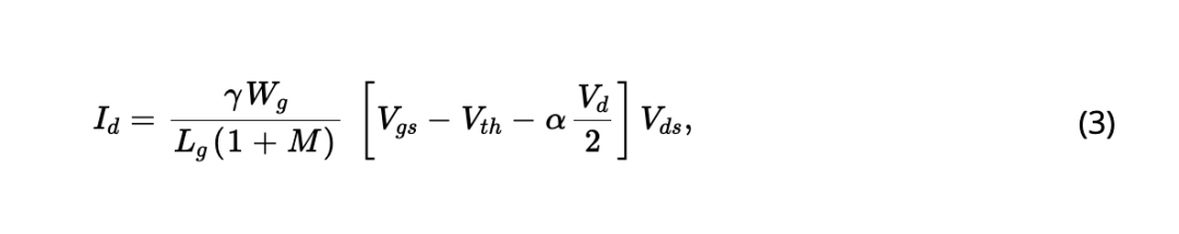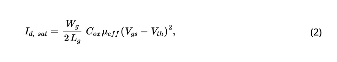 对于迁移率不依赖于栅极电压或串联电阻的理想 MOSFET,可以使用饱和区的二次模型计算有效电子迁移率 µeff,如下所示: