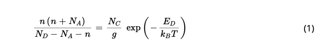 其中n表示导带中的自由电子浓度,ND表示磷浓度(phosphorous concentration),NA表示补偿受主密度(compensating acceptor density),NC表示有效导带态密度(effective conduction band density of states),g表示施主简并因子(degeneration factor of the donors),ED表示供体的活化能(the activation energy of the donors),kB是玻尔兹曼常数,T表示温度。