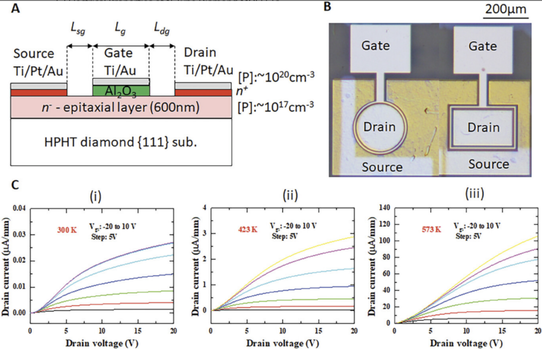 在这项研究中,基于阶梯流横向生长模式(step-flow lateral growth mode)实现了具有原子级平坦平台的电子级n型金刚石。因此,在不观察跳跃电导率的情况下获得了具有约1017 cm-3的低施主浓度的N型金刚石。因此,可在 573 K 工作温度的 n 型金刚石 MOSFET 已成功开发。573 K下的实验场效应电子迁移率约为150cm2V-1s-1,这是高温下所有宽带隙半导体中最高的。